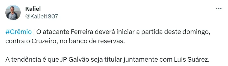 Trata-se do atacante Ferreira, que aparentemente não teve nenhum problema físico. Então, a atitude de Renato tem boas chances de ter sido tomada por uma questão técnica. Porém, ainda não há a confirmação disso. Sendo assim, João Pedro Galvão, um dos reforços do Tricolor de Porto Alegre nesta janela de transferência, deverá formar a dupla de ataque com o uruguaio Luis Suárez.