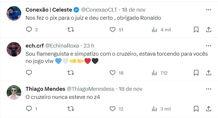 “Cruzeiro permanece na Série A depois dessa vitória agora acho que as chances de cair praticamente zera. Quer dizer, não zera, mas não cai mais. Acho que não cai mais, ganha moral. Tem um jogo a menos também”, destacou Sheik.