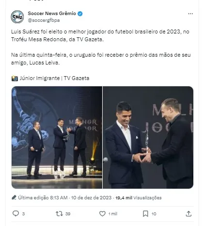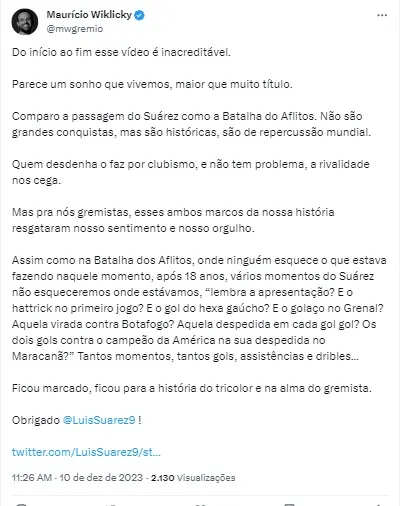 Suárez falou sobre seu ano no Tricolor: “Foi um ano que não acreditava que ia jogar aqui no Brasil, mas aconteceu. Aproveitamos muito com minha família fora de campo também. Se eu te falar que tem muito jogo, viagens muito longas. Mas acho que também como o Renato também conhece e sabe administrar essa situação foi bem”.