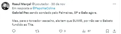 Após o jogo, Rodrigo Caetano que estava sem voz falou sobre a possibilidade de Gabriel Pec, jogador do Vasco fechar com o Galo em 2024.