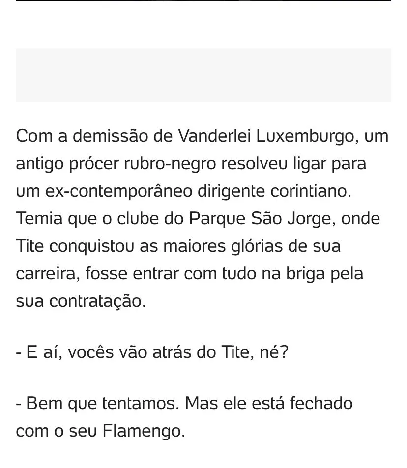 Porém, segundo informado pelo jornalista Luis Fabiani, correspondente da Itatiaia em São Paulo, o preparador físico e amigo do treinador Fábio Mahseredjian sinalizou que tem interesse em retornar ao Parque São Jorge no final desta tarde de quarta-feira (27). Sendo assim, o Timão estava atravessando o Flamengo para ter o ídolo de volta, inclusive, o último trabalhode Tite antes de assumir a Seleção foi no próprio Corinthians.