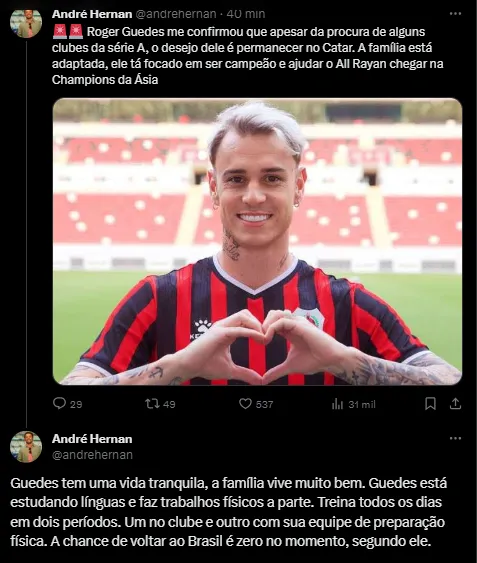 “Roger Guedes me confirmou que apesar da procura de alguns clubes da série A, o desejo dele é permanecer no Catar. A família está adaptada, ele tá focado em ser campeão e ajudar o All Rayan chegar na Champions da Ásia“, escreveu Hernan no X (antigo Twitter).