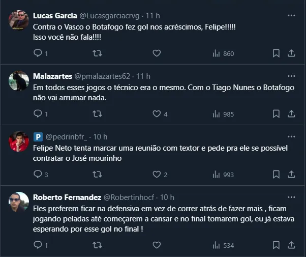 “O problema do Botafogo é a FIFA insistir no segundo tempo ter mais de 40 minutos. Nos últimos 19 jogos, o Botafogo perdeu ou tomou o empate com gol depois dos 40 do segundo tempo oito vezes. Torcer pra esse time é um martírio”, disse.