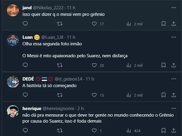 No entanto, ao final da partida, os dois ex-jogadores do Barcelona (ESP) trocaram uma longa ideia no gramado e foram fotografados. Além disso, Messi publicou o conteúdo em suas redes sociais e agitou os gremistas. Enquanto alguns ficaram tristes pela saída de Suárez, outros gostaram que a camisa do Grêmio apareceu para mais de 490 milhões de seguidores do argentino.