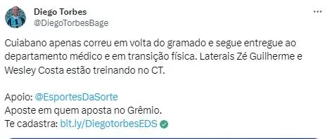 Segundo informação do jornalista Diego Torbes, divulgada nesta quinta-feira (19), Cuiabano apenas correu em volta do gramado do CT Luiz Carvalho, dando indícios de que ainda não está pronto para ser relacionado, O departamento médico do Grêmio irá reavaliar a situação do jogador que está se recuperando, já que Renato Portaluppi não tem uma opção disponível no elenco principal, no entanto, há a caminhos pela base do Tricolor dos Pampas.