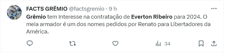Entretanto, o nome de outro jogador Rubro-Negro vem sendo debatido nos bastidores do Grêmio para a próxima temporada. Em fim de contrato com a equipe carioca e com o futuro ainda indefinido, o nome de Everton Ribeiro é visto com bons olhos pela diretoria e comissão técnica da equipe.