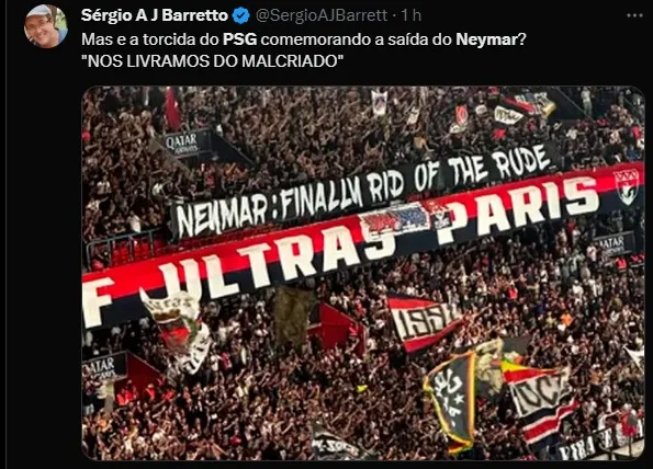 Em uma das faixas dizia: Neymar: Finalmente nos livramos do malcriado”. Camisa 10 da Seleção Brasileira, Neymar é alvo de críticas da torcida do PSG há pelo menos dois anos, até mesmo na antiga casa do jogador na França houve protestos dos torcedores da equipe da capital francesa.