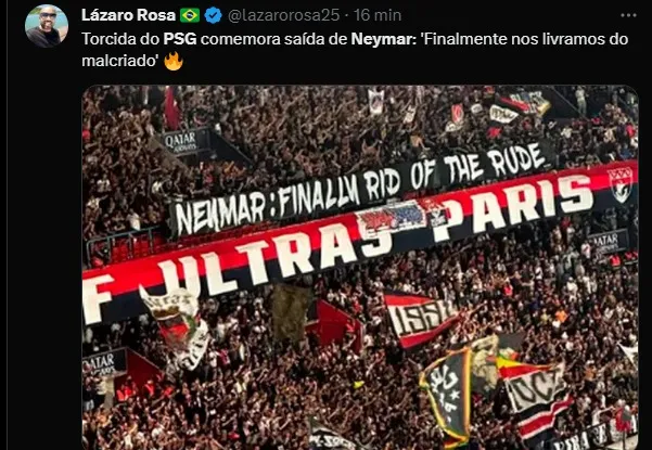 Neymar deixou o PSG para atuar no Al Hilal da Arábia Saudita, mas os torcedores da equipe da França parecem que jamais vão esquecer do craque brasileiro. Faixas foram feitas para o jogador no estádio Parque dos Príncipes, em Paris, em jogo da equipe pela Ligue 1.