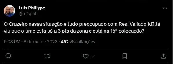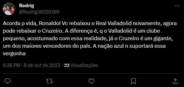 “Acorda pra vida, Ronaldo! Você rebaixou o Real Valladolid novamente, agora pode rebaixar o Cruzeiro. A diferença é, que o Valladolid é um clube pequeno, acostumado com essa realidade, já o Cruzeiro é um gigante, um dos maiores vencedores do país. A nação azul não suportará essa vergonha”, “A maior parte da torcida merece isso mesmo, passaram pano pra gestão Ronaldo que vai transformar o Cruzeiro em time ioiô igual o Valladolid…” e “O Cruzeiro nessa situação e tudo preocupado com Real Valladolid? Já viu que o time está só a 3 pts da zona e está na 15° colocação?”, foram alguns dos comentários.