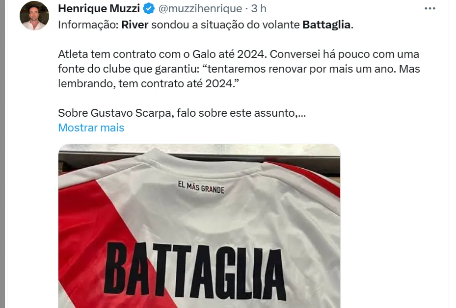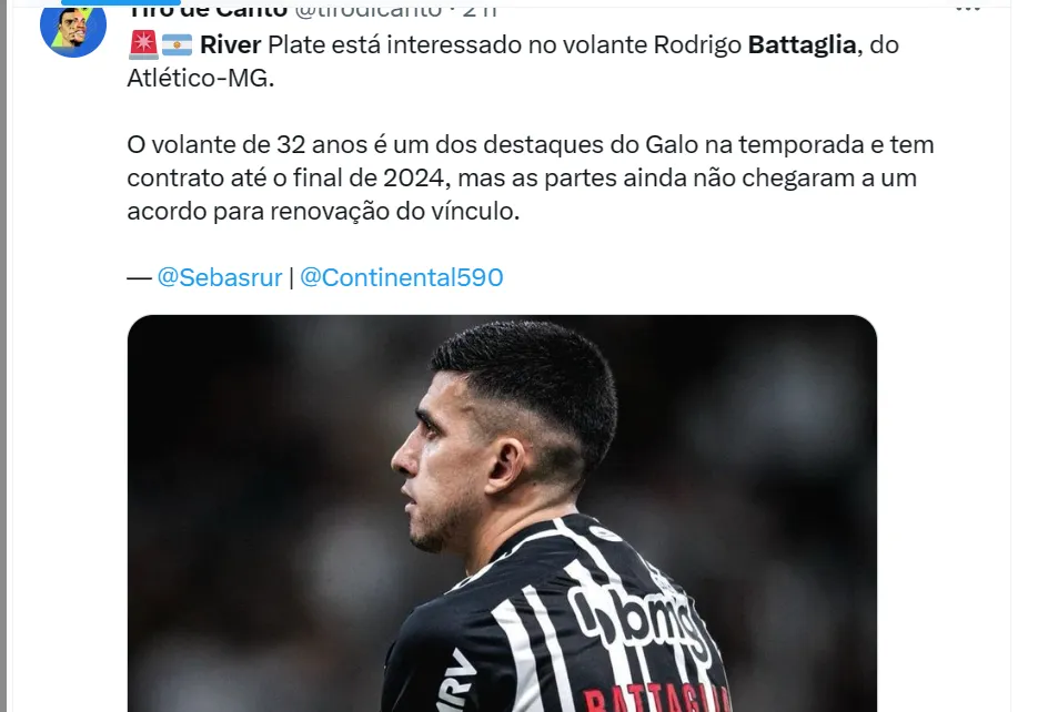 Vale reforçar que o River está de olho em Battaglia, enquanto que o Atlético está de olho em Nicolas De La Cruz, meia da seleção uruguaia e também na mira de Flamengo e Palmeiras.