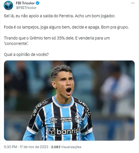 Para além do negócio de Ferreirinha, o torcedor do Grêmio está ligado com o que vai acontecer nas próximas rodadas do Brasileirão. O Tricolor Gaúcho está na 3ª colocação, atrás apenas do Botafogo e do Palmeiras.