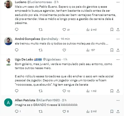Nas redes sociais, um torcedor do Esquadrão de Aço foi cobrar o goleiro pelas suas atuações nestes jogos. “Você é frangueiro, pensei que você era bom. Saia do meu Bahêa, me faça esse favor urgente”, falou um torcedor.