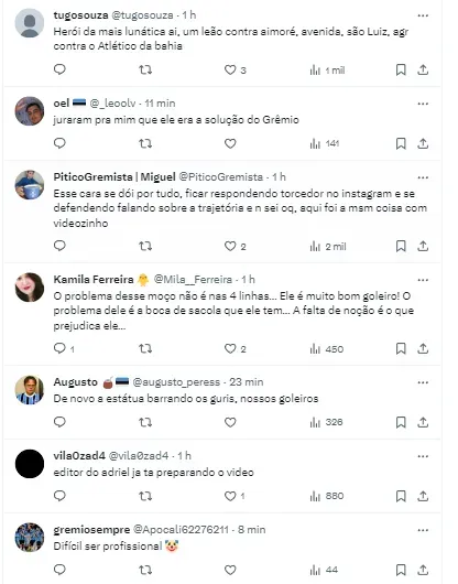 Para piorar a situação, está viralizando nas redes sociais um print de uma discussão no chat do Instagram entre Adriel e um torcedor do Bahia. O torcedor teria mandado uma mensagem e o arqueiro respondeu.