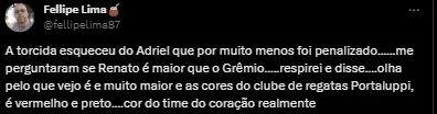 “Renato queimou o Adriel (um piá mal orientado, mas era nosso melhor goleiro) por, segundo ele, ser indisciplinado. Hoje, o treinador deu as costas pro clube após o time ter tomado um chocolate do rival. Vergonhoso!!!”. “A torcida esqueceu do Adriel que por muito menos foi penalizado… me perguntaram se Renato é maior que o Grêmio… respirei e disse… olha pelo que vejo é e muito maior e as cores do clube de regatas Portaluppi, é vermelho e preto… cor do time do coração realmente”, comentaram torcedores.