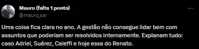 Outro torcedor do Imortal relembrou outros casos polêmicos que aconteceram no Grêmio neste ano. “Uma coisa fica clara no ano. A gestão não consegue lidar bem com assuntos que poderiam ser resolvidos internamente. Explanam tudo: caso Adriel, Suárez, Caleffi e hoje essa do Renato”.