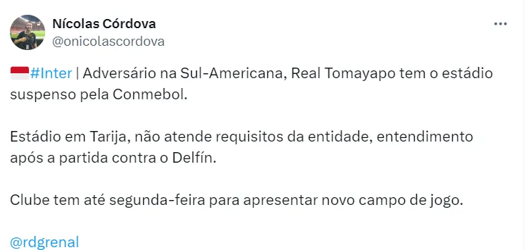 O Internacional, com isso, não sabe onde enfrentará o Real Tomayapo. Os times se enfrentam pela 4ª rodada da Sul-Americana, em jogo previsto para o dia 7 de maio.