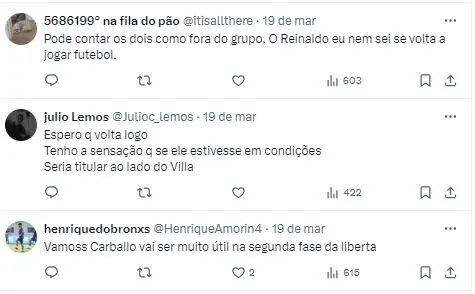 No entanto, o departamento médico do Clube tem duas preocupações sérias e sem previsões de retorno. Reinaldo, que trata de uma lesão no joelho, levanta dúvidas sobre o tratamento que deve ser adotado, tanto que o Imortal já traçou a estratégia para tomar a decisão sobre uma possível cirurgia.