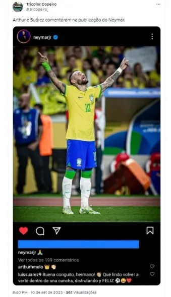 Suárez fez um comentário em espanhol, entretanto o atleta mencionou estar feliz por ver Neymar voltar aos gramados, curtindo e feliz. O uruguaio jogou com o brasileiro no Barcelona, quando faziam o trio MSN, Messi, Suárez e Neymar. Uma era bastante lembrada até os dias atuais.