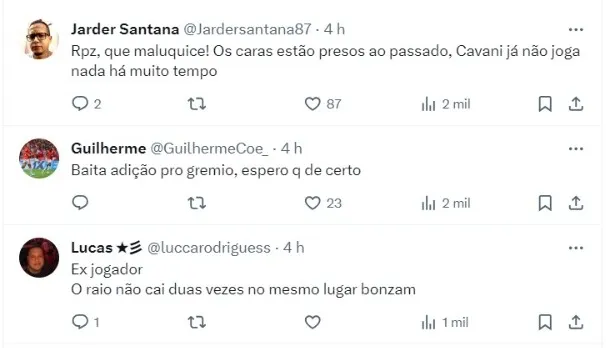 “Nunca houve papo do Gabigol no Grêmio, mais uma vez vou pedir para vocês não inventarem história, não existe nada também quanto ao Cavani. Esses dois nomes não tem nenhuma possibilidade de virem ao Grêmio”, afirmou Renato.