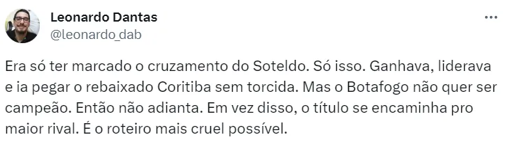 Ainda, com apenas duas rodadas restantes, o Botafogo precisaria de bons resultados contra o Cruzeiro, no Nilton Santos, e contra o Internacional, no Beira-Rio, além de falhas do Palmeiras e do Flamengo para tentar recuperar a taça.