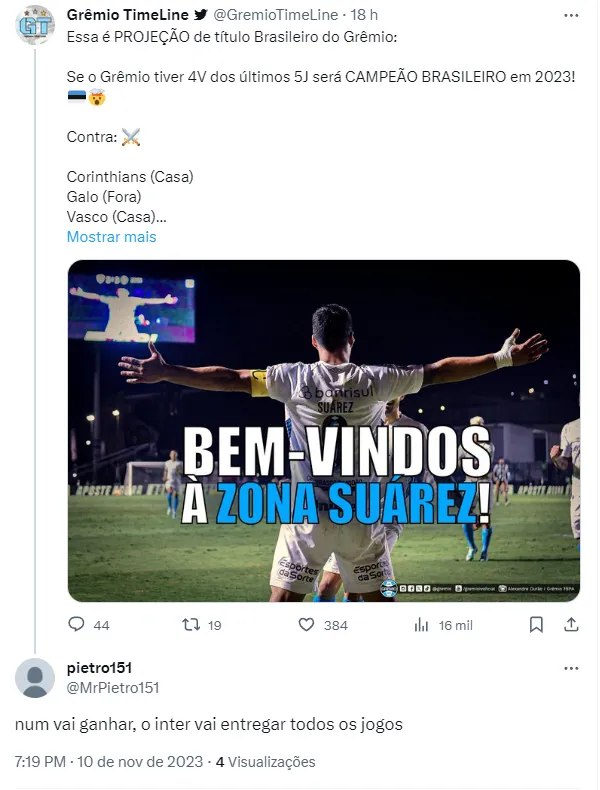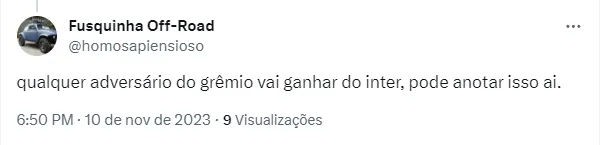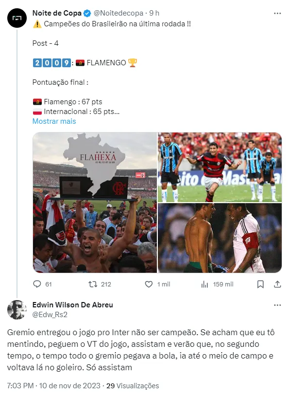 Muitos torcedores lembraram na web que o Brasileirão de 2023 pode se assemelhar, em partes, aos de 2009. Na época, Internacional, Palmeiras e Flamengo foram para a última rodada com chances de títulos. Porém, com uma vitória em cima do Grêmio, o time do Rio foi quem levou a melhor.