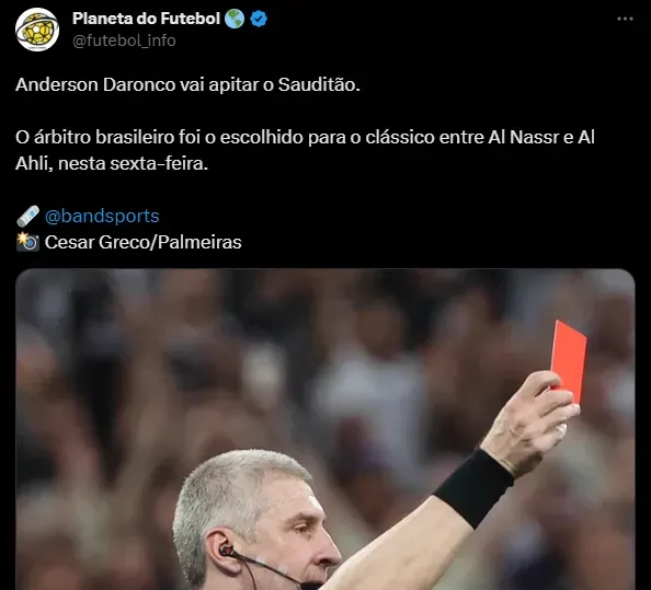 Trata-se de Anderson Daronco, árbitro brasileiro, que vem somando diversas polêmicas nas últimas partidas e apitou o duelo de ida da final da Copa do Brasil, na vitória por 1 a 0 do São Paulo contra o Flamengo. O gaúcho embarca nesta sexta-feira (20) para atuar na partida entre Al-Nassr e Al-Ahli, sexta-feira (22), às 15h, ou seja, vai apitar um duelo de Cristiano Ronaldo, Mané, entre outras estrelas.