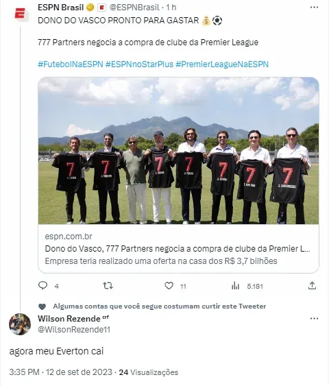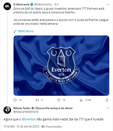 Segundo informação publicada por portais como Bloomberg, The Telegraph, BBC e Globo Esporte, a 777 Partners está bem perto de adquirir o Everton, que disputa a Premier League. Se de primeira a notícia não tem ligação direta com o Vasco, a torcida do Gigante da Colina começa a se preocupar em como isso pode impactar o time carioca em breve. Com mais grana da empresa sendo utilizado em um novo Clube, com qual verba o Cruz-Maltino seria reforçado?