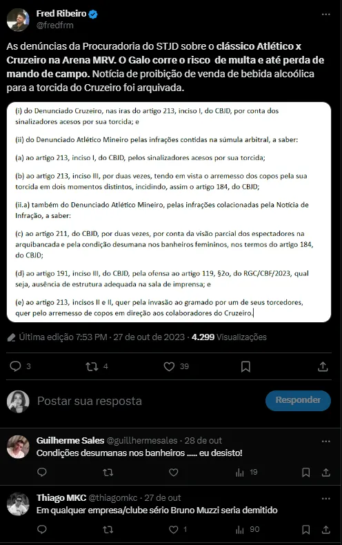 O primeiro clássico realizado na Arena MRV continua a gerar repercussões, não apenas pela histórica vitória do Cruzeiro, mas também devido às polêmicas que cercaram o evento. O jogo foi marcado por atos de vandalismo e depredação cometidos por torcedores cruzeirenses no espaço destinado aos visitantes, deixando o clube celeste em uma situação delicada.