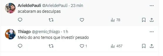 Mesmo com a chegada de jogadores como Diego Costa, Pavón e Soteldo, muitos torcedores do Grêmio avaliam que mais peças precisam chegar no elenco. Porém, o presidente Alberto Guerra vem tendo dificuldades no mercado da bola.