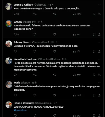 “O Grêmio ainda não conseguiu estimar o tamanho do prejuízo financeiro que terá, mas analisa impactos preliminares”, iniciou o profissional em seu perfil na web.