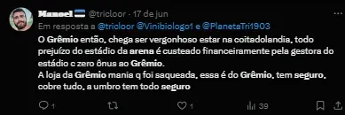 Em entrevista para o site Globo Esporte, o presidente Alberto Guerra revelou que a diretoria está de olho em tudo o que fiz respeito a Arena do Grêmio. Ele revelou que um valor está chegando para ajudar na recuperação.
