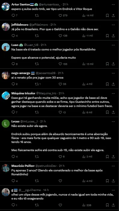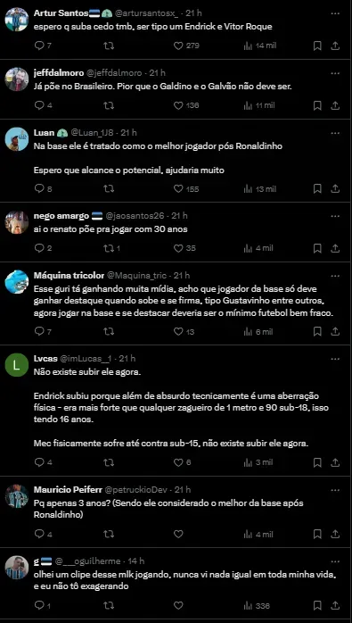 A torcida gremista está com uma enorme expectativa para que o jovem possa até figurar no elenco profissional. Ele ainda vai ter de se consolidar nas categorias de base.
