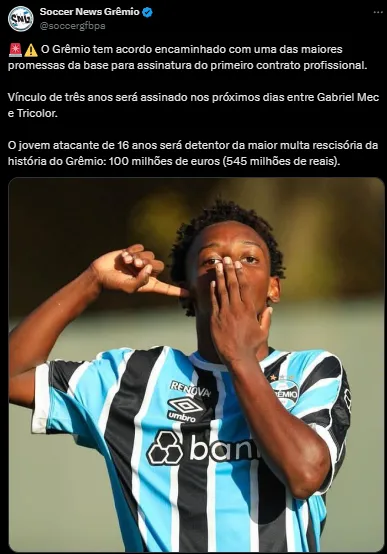 “O jovem atacante de 16 anos será detentor da maior multa rescisória da história do Grêmio: 100 milhões de euros (545 milhões de reais)”, concluiu o perfil nas redes sociais.
