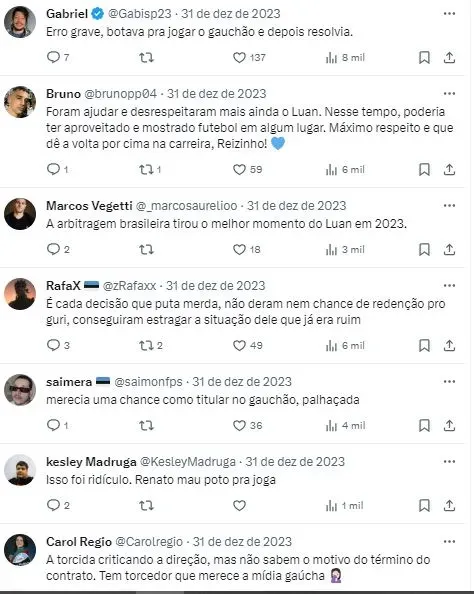 Contudo, o caso de Luan, que levantou expectativa sobre a permanência, foi resolvido. O jogador não seguirá no Grêmio. No apagar das luzes de 2023, a direção soltou o comunicado informando sobre a não renovação do camisa 7.