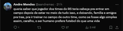 “Agora é salvar o próximo. É o que gostaríamos de passar em rede nacional. Ainda que não passe 10% do que está acontecendo aqui. E não é crítica, é difícil entender, mas para mostrar que não tem como pensar em futebol”, completou.
