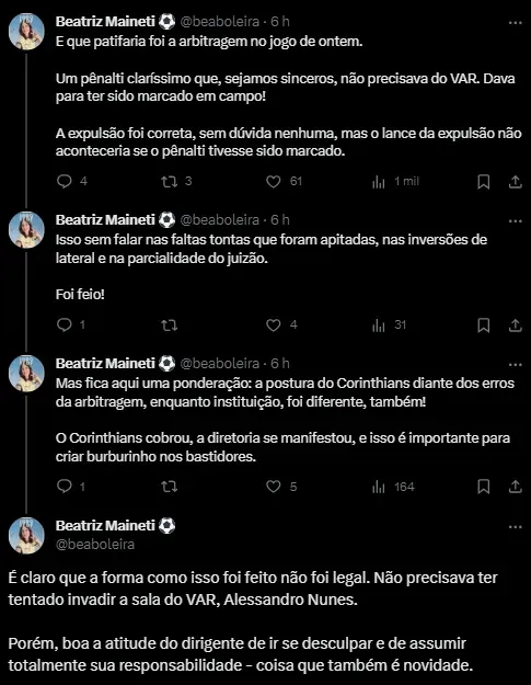 A súmula registra insultos como “vagabundo” e “ladrão” proferidos por Alessandro e pelo presidente do Corinthians, respectivamente. A tentativa de invasão à sala do VAR também consta no documento, indicando possíveis denúncias no Superior Tribunal de Justiça Desportiva (STJD).