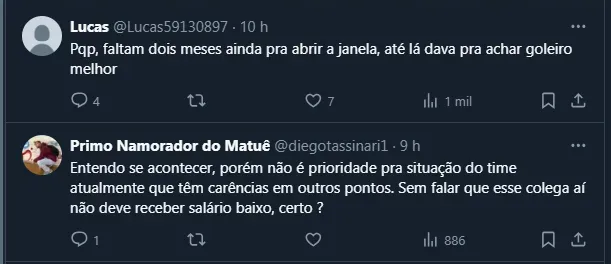 Isso porque, enquanto alguns cruzeirenses entendem ser importante ter um goleiro com esse peso, outros acreditam que o elenco tem outras prioridades, como a defesa e o ataque, por exemplo.