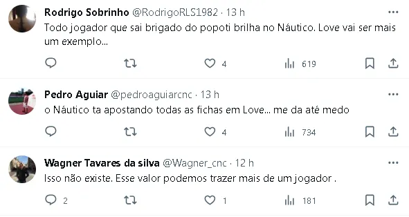 Embora o Náutico tenha atingido seu limite financeiro na proposta, não há intenção de realizar um “leilão” pelo jogador, e a expectativa é que haja uma rápida definição sobre o futuro de Vagner Love.