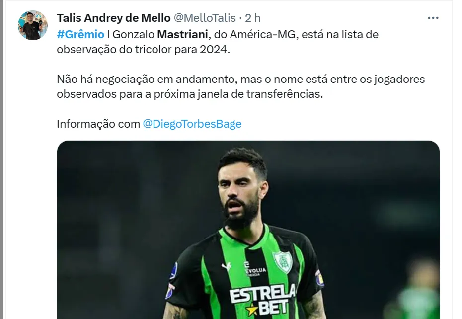 Há algumas semanas, noticiamos que o uruguaio Gonzalo Mastriani, do América-MG, havia sido indicado por meio de empresários a Renato Portaluppi. Aos 30 anos, Mastriani é o artilheiro do Coelho, rebaixado com antecedência no Campeonato Brasileiro, com 21 gols em 40 jogos.