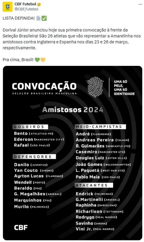 Com isso, diversos torcedores se preocupam com os resultados dos dois amistosos que o Brasil fará no final de março de 2024. Dos últimos dez confrontos do Brasil, a Seleção Canarinho teve um resultado negativo em sete deles.