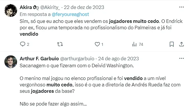 Endrick do Palmeiras, por exemplo, nem completou 18 anos e já está vendido ao Real Madrid, em uma negociação de 72 milhões de euros (R$ 382 milhões na cotação atual).