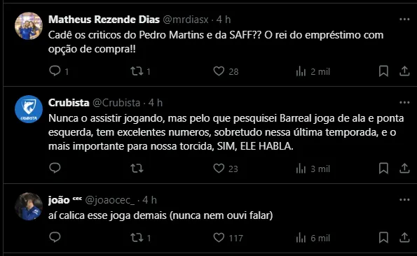 Barreal é revelado pelo Vélez Sarsfield, da Argentina, e deve chegar por empréstimo ao Alviceleste. O jogador de 23 anos é versátil e pode atuar de lateral-esquerdo ou mais avançado.