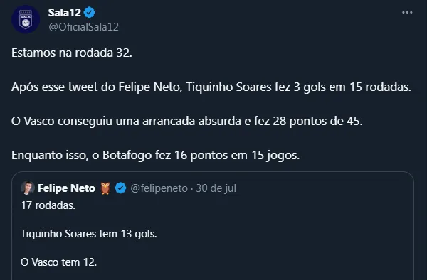 No dia 30 de julho de 2023, o Botafogo sobrava na liderança do Brasileirão e o Vasco lutava contra o rebaixamento. Na época, o influenciador botafoguense Felipe Neto publicava em sua conta no Twitter uma provocação ao Vasco.