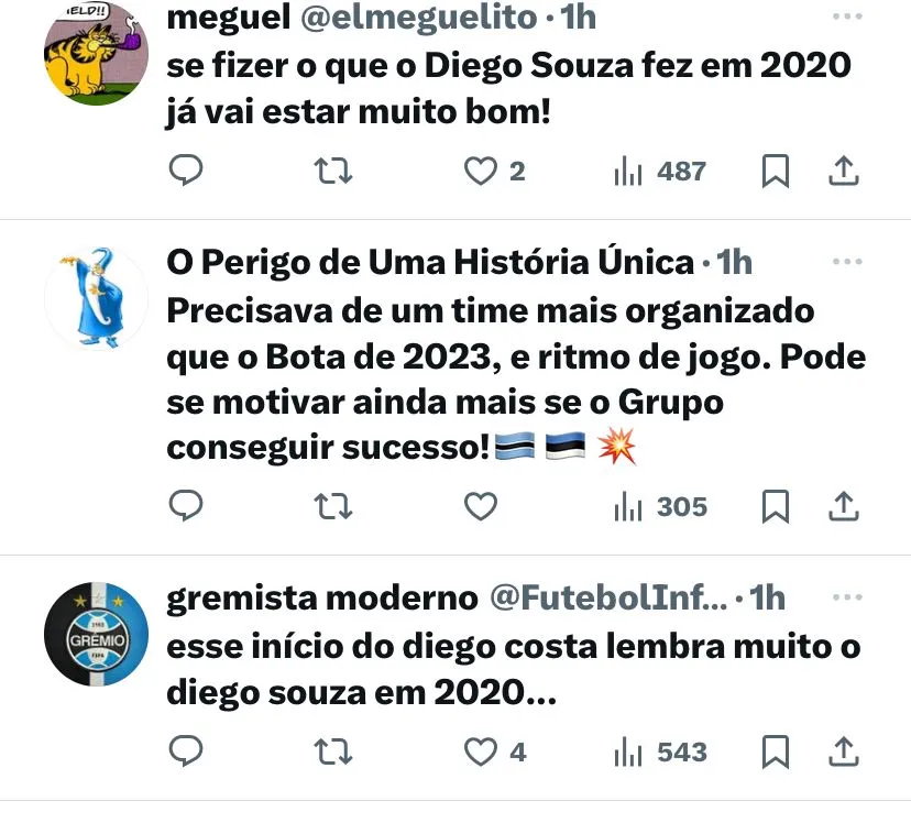 Já no Glorioso, ele marcou três vezes em 15 jogos. Atualmente, jogando pelo Grêmio, ele se colocou como artilheiro do time ao lado de Cristaldo e também de Michel, do Bagé, no Campeonato Gaúcho. Com isso, até aqui, Diego Costa vem fazendo valer a pena todo o investimento feito pela gestão de Guerra.