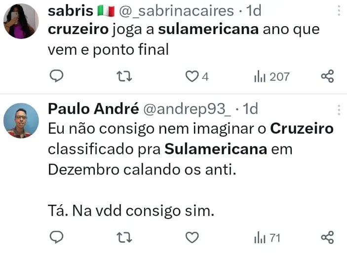 Você acredita na classificação do Cruzeiro para a Copa Sul-Americana 2024?