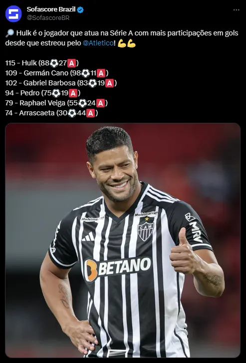 Além disso, Hulk é o jogador que mais contribuiu com gols desde sua estreia pelo Atlético na Série A, com 115 participações em gols (88 gols e 27 assistências), ultrapassando craques como Germán Cano e Arrascaeta. Esses números ressaltam sua versatilidade como atacante, não apenas como um finalizador, mas também como um jogador capaz de criar oportunidades para seus companheiros. Seu desempenho impressionante o torna uma figura central no sucesso do Atlético Mineiro.