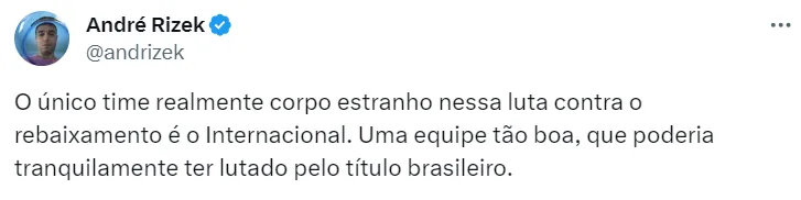 Chegando aos 38 pontos em 29 jogos, o Internacional ocupa agora a 11ª posição da tabela do Campeonato Brasileiro. Além disso, a probabilidade de queda da equipe já é inferior aos dois pontos percentuais. Com a confiança acumulada de um atropelo por 7 a 1 contra o Santos, em casa, e uma vitória por 2 a 1 contra o Vasco em São Januário, a Série B vai se tornando um pesadelo cada vez mais distante.