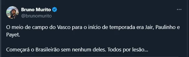 Por fim, a tendência é que Payet fique de fora das partidas contra Grêmio, Red Bull Bragantino, Fluminense e Criciúma. Quer dizer, a expectativa é que ele retorne ao time contra o Athletico Paranaense, pela 5ª rodada.
