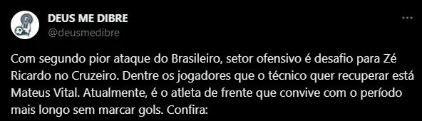 Vale destacar que a equipe Celeste marcou apenas 23 gols até aqui no Brasileirão, mesmo número do Santos. Os únicos times piores nesse quesito são o Internacional e o Goiás, ambos com 20 tentos anotados. Quer dizer, até times como Coritiba e América, que estão afundados no Z-4, possuem ataques mais positivos do que a Raposa. O próximo compromisso para apagar esta imagem será no domingo (1), justamente contra o Coelho.