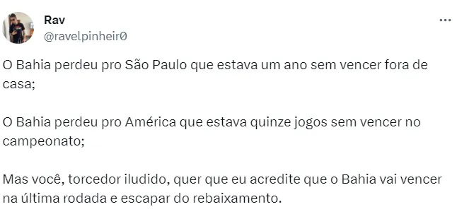 Porém, embora não seja impossível, a permanência do Tricolor é pouco provável. Ocupando a 17ª colocação, com 41 pontos, o Bahia possui dois a menos que o Santos, 15º colocado, e precisa de uma combinação de resultados para se salvar.